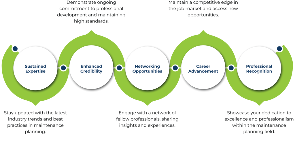 • Professional Development: Complete a minimum of 60 continuing education units (CEUs) related to maintenance planning during the three-year recertification cycle.